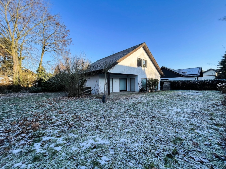 genießen Sie einen herrlichen Blick auf den liebevoll gestalteten, umlaufenden Garten, den Sie über eine überdachte Terrasse erreichen können.