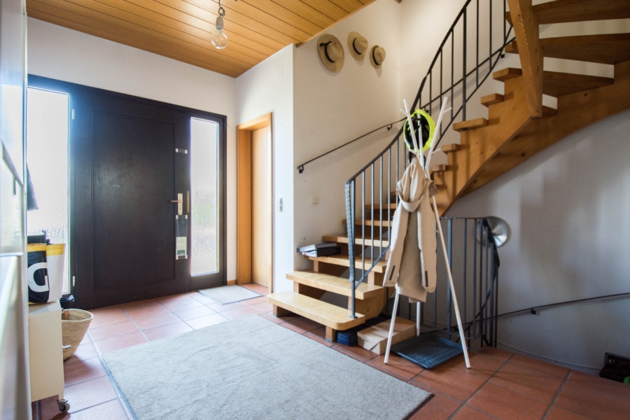Über eine offene und breite Treppe erreichen Sie das Obergeschoss. Hier befinden sich drei Schlafzimmer, sowie ein zweites Badezimmer, alle erreichbar von einem zentral gelegenen Flur.