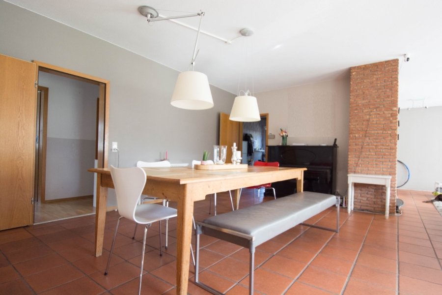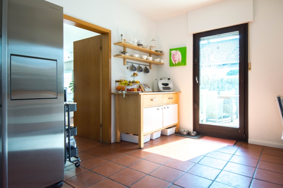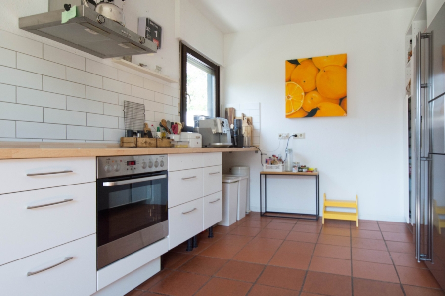Direkt neben dem Esszimmer befindet sich die geräumige Küche, welche mit einer Einbauküche samt Elektrogeräten (Herd, Ofen, Dunstabzugshaube) ausgestattet ist, und von der Sie ebenfalls auf die Terrasse und weiter zum Garten gelangen können. Zusammen mit der Terrasse und dem Garten, bilden das Wohn- und Esszimmer sowie die Küche einen wundervollen Bereich für entspannte Stunden mit Familie und Freunden! Und im Winter sorgt der Kaminofen im Wohnzimmer für wohlige Wärme – eigebettet in eine dekorative Ziegelverkleidung ist er obendrein noch ein schöner Hingucker.