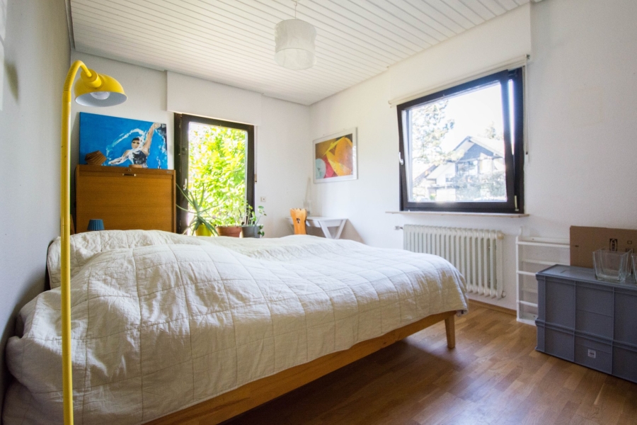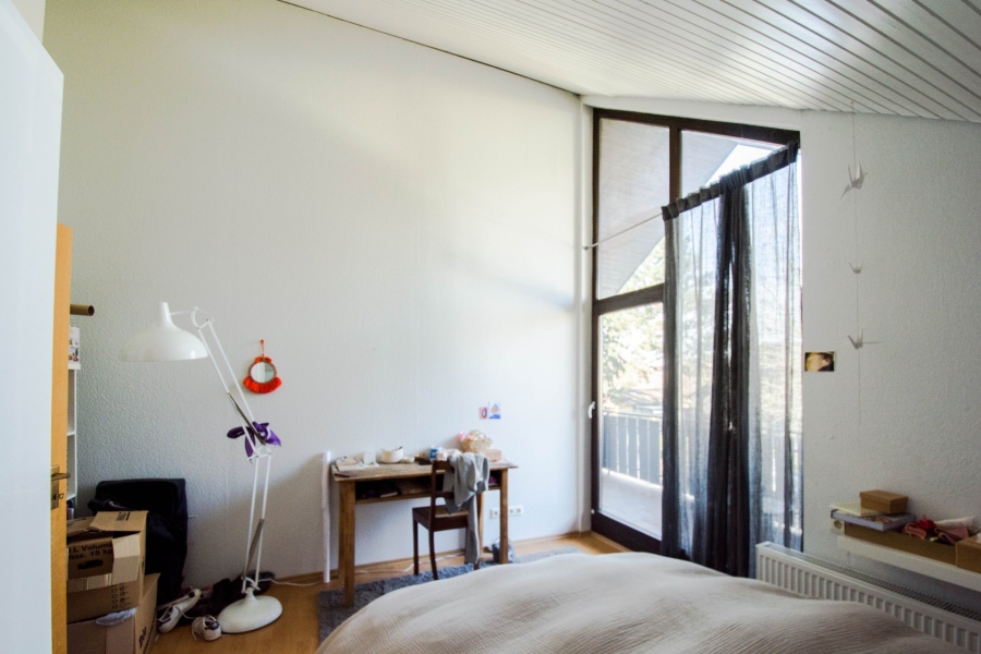 Direkt rechterhand befindet sich das erste Schlafzimmer und daneben das Zweite, beide sind offen bis zum Dach und verfügen über deckenhohe Fenster mit jeweils einem Zugang zu dem gemeinsamen, über die gesamte Hausbreite verlaufenden und überdachten Balkon, von dem sich der fantastische Weitblick bis über das Rhein-Main-Gebiet erstreckt. Die Fenster verleihen beiden Zimmern einen charmanten Touch und sorgen für viel Tageslicht.