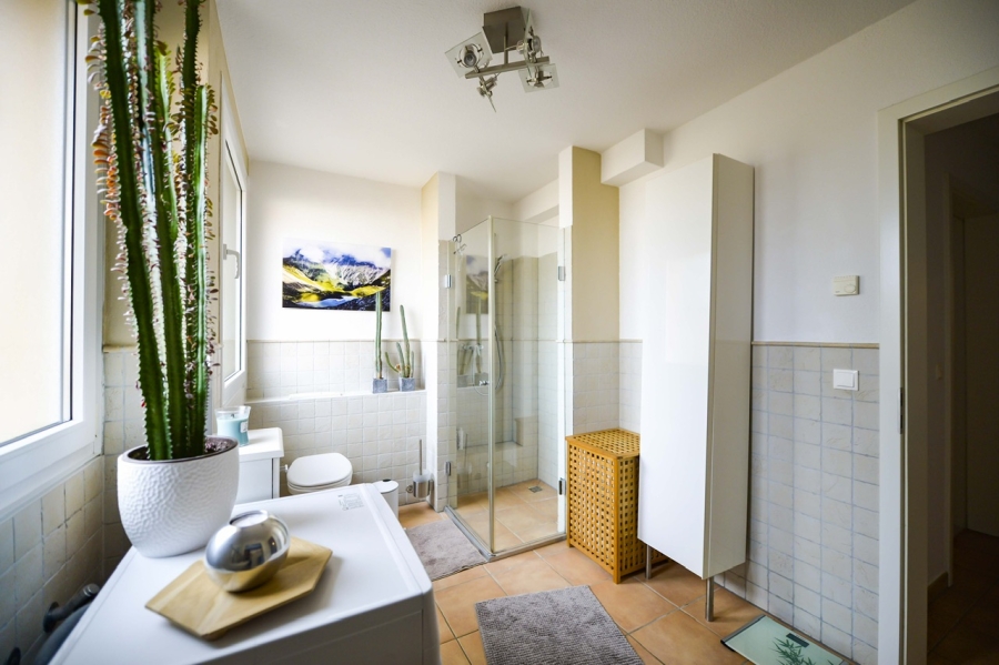 Direkt an das Hauptschlafzimmer schließt das Tageslicht-Badezimmer an, welches dank den kleinformatigen, hellgrauen Wandfliesen mit Natursteinstruktur einen südländischen Touch erhält. Hier befindet sich auch der Waschmaschinenanschluss.